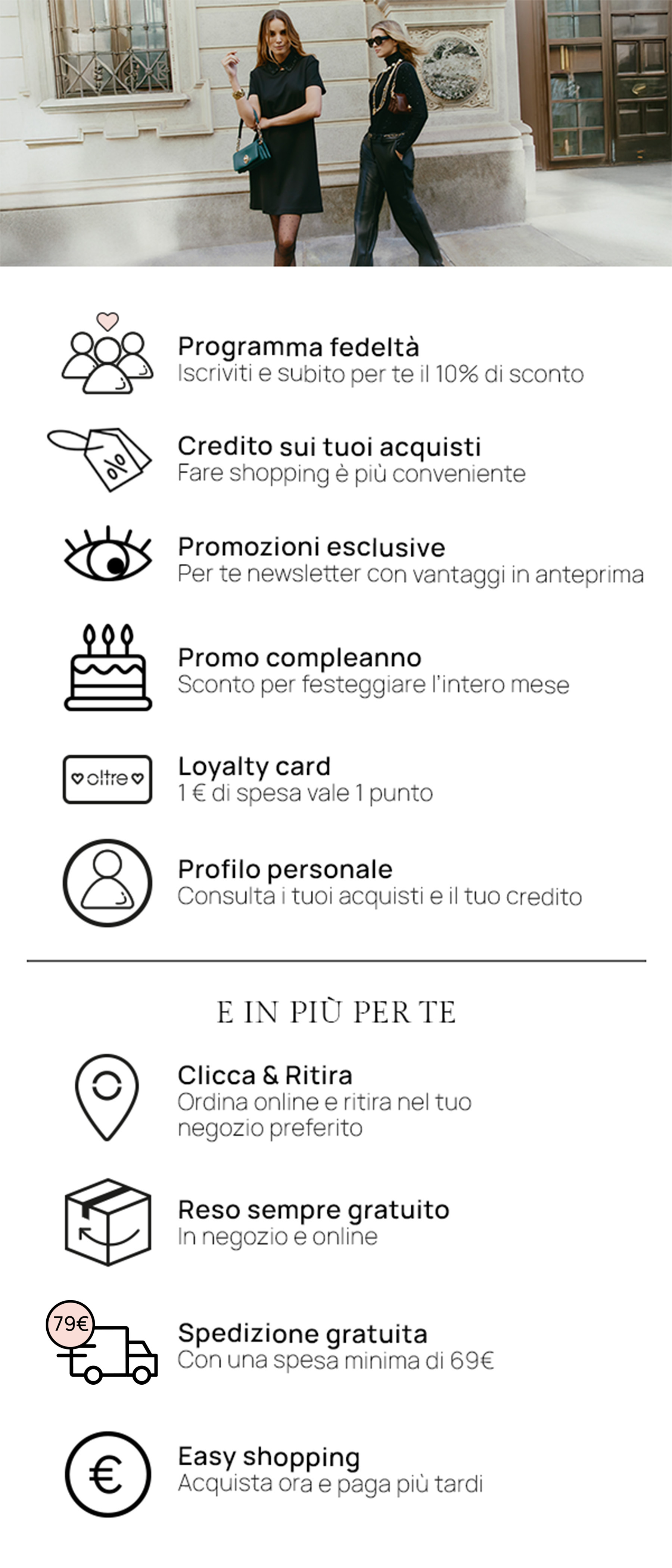 • Accesso anticipato alle promozioni esclusive: acquista i tuoi capi preferiti prima di chiunque altro